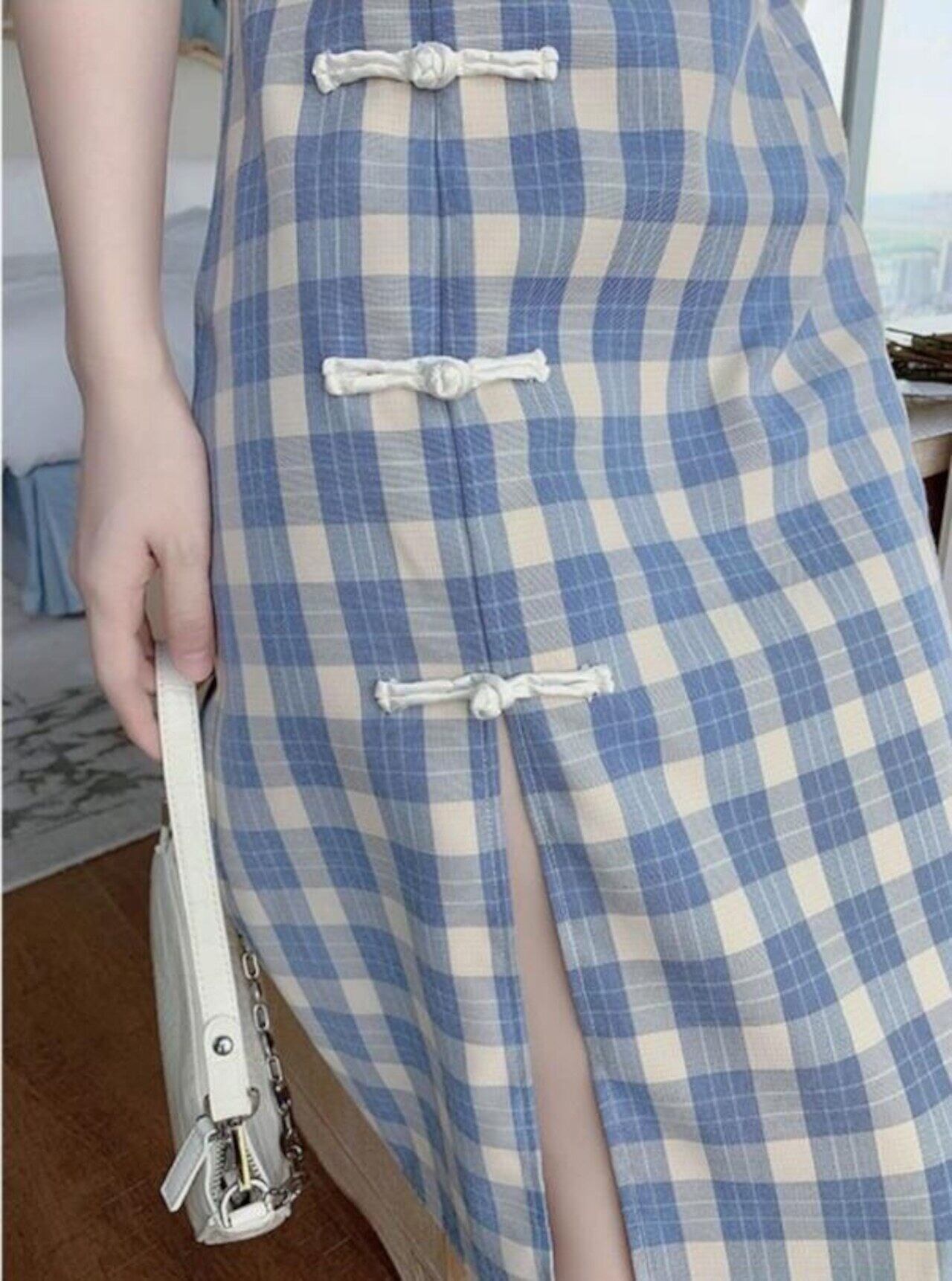 レディース ハイウエスト 半袖 チェック柄 ロング ワンピース A068